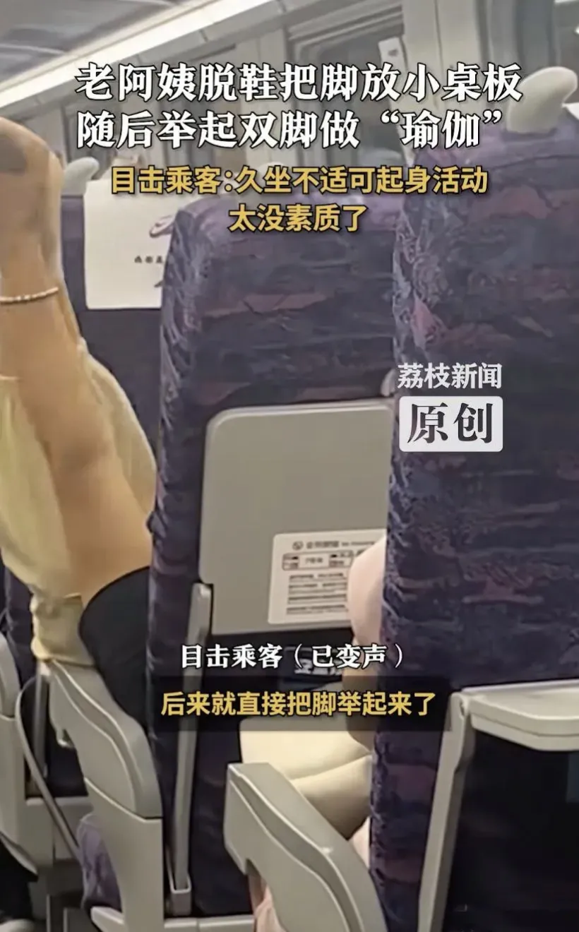 我之前坐高铁,也碰到过不文明的事。有回旁边大哥脱了鞋,把脚塞到前面座椅底下,那味儿飘过来,我全程捂着鼻子。但像这位女士直接在车厢里做“瑜伽”的,还是头一回见。